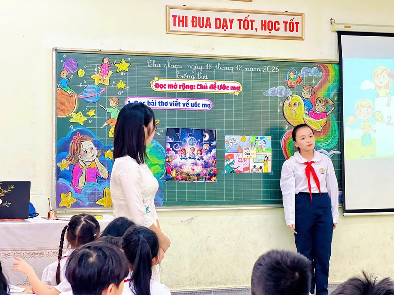 Dưới sự dẫn dắt tận tình của cô, học sinh được tham gia thảo luận, đọc các bài thơ, chia sẻ nội dung và ước mơ được nói đến trong bài. Cô luôn lắng nghe, động viên và khích lệ kịp thời, giúp các em vượt qua sự rụt rè, tự tin sử dụng tiếng Việt để thể hiện năng khiếu, cảm xúc và khả năng sáng tạo. Mỗi lời nhận xét, mỗi cử chỉ gần gũi của cô đều góp phần nuôi dưỡng ở học sinh niềm yêu thích môn Tiếng Việt và sự mạnh dạn khi giao tiếp.