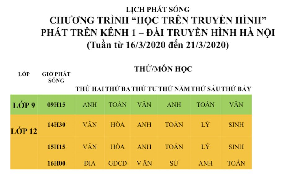 Lịch phát sóng tuần từ 16/3/2020 đến 21/3/2020; Chương trình học trên truyền hình phát sóng trên kênh 1 – Đài Phát thanh và Truyền hình Hà Nội cụ thể như sau: